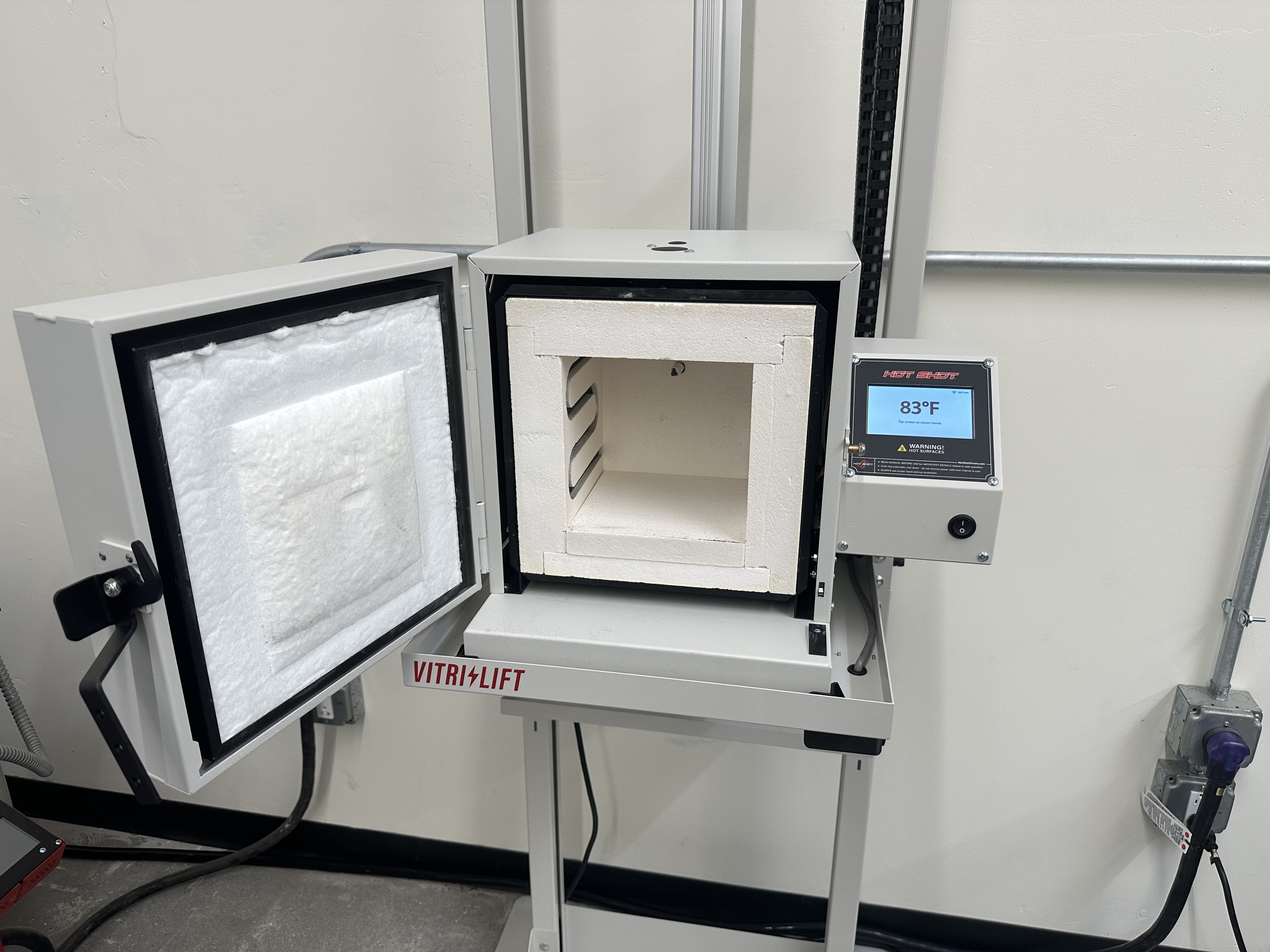 Vitrigraph Kiln, has both full floor or vitrigraph floor. Mounted on Floor standing VitriLift that offers motorized hight adjustment of kiln between 38″ and 78″ AFF